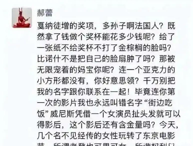 前段时间她还点评辛芷蕾拿奖的事,感觉像是她跟导演闹不合了,后来还被剧组除名了,挺麻烦的。