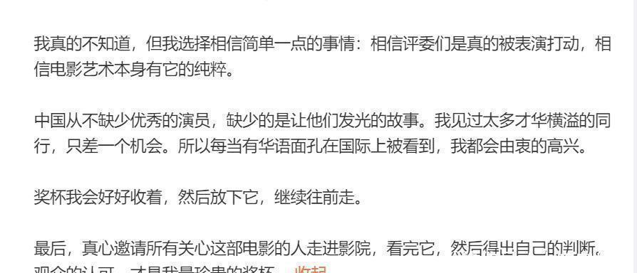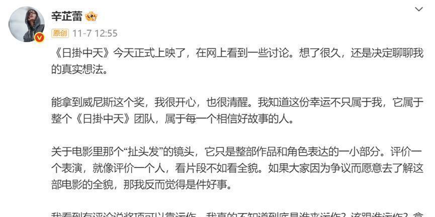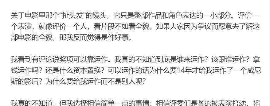 她一开头就祝贺自己的电影上映了,遇到一些讨论的时候,觉得有必要把自己真实的心里话说出来。